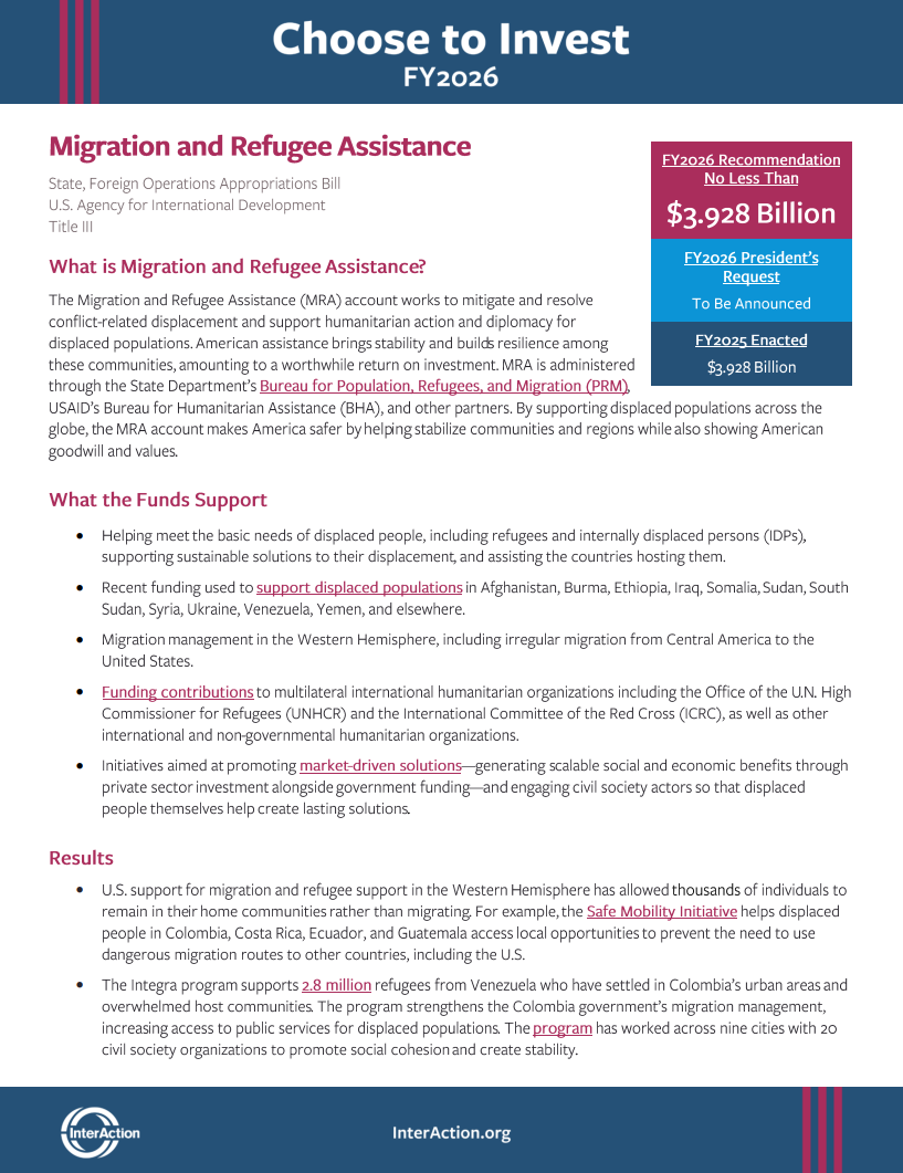 The Migration and Refugee Assistance (MRA) account works to mitigate and resolve conflict-related displacement and support humanitarian action and diplomacy for displaced populations. American assistance brings stability and builds resilience among these communities, amounting to a worthwhile return on investment. MRA is administered through the State Department’s Bureau for Population, Refugees, and Migration (PRM), USAID’s Bureau for Humanitarian Assistance (BHA), and other partners. By supporting displaced populations across the globe, the MRA account makes America safer by helping stabilize communities and regions while also showing American goodwill and values.