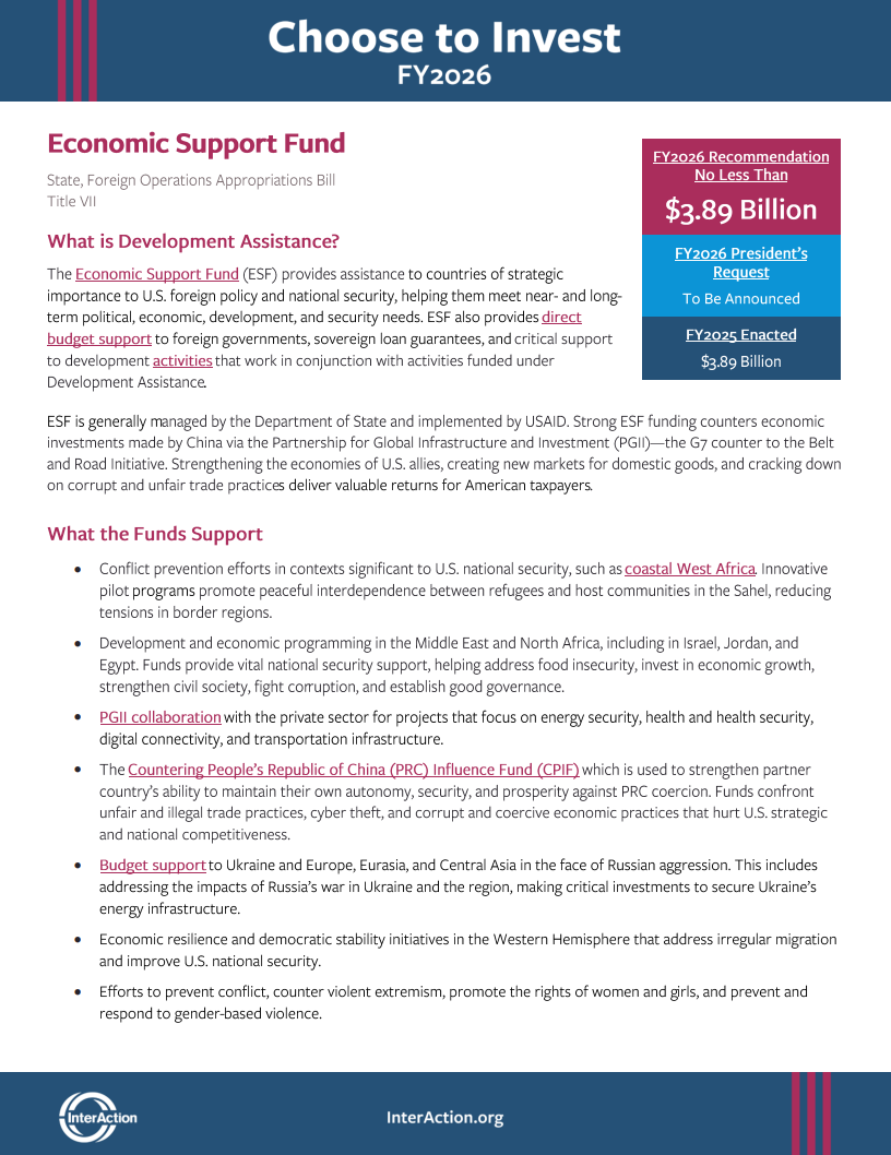 ESF is generally managed by the Department of State and implemented by USAID. Strong ESF funding counters economic investments made by China via the Partnership for Global Infrastructure and Investment (PGII)—the G7 counter to the Belt and Road Initiative. Strengthening the economies of U.S. allies, creating new markets for domestic goods, and cracking down on corrupt and unfair trade practices deliver valuable returns for American taxpayers.